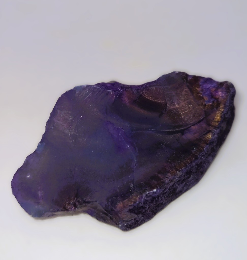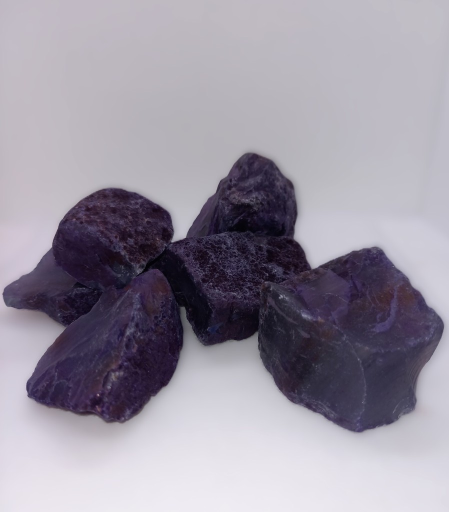 Varje sten är unik i form och färgskiftning, med naturliga mönster som påminner om kosmiska landskap. Den lila tonen sägs främja andlig klarhet, lugn och intuition.