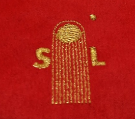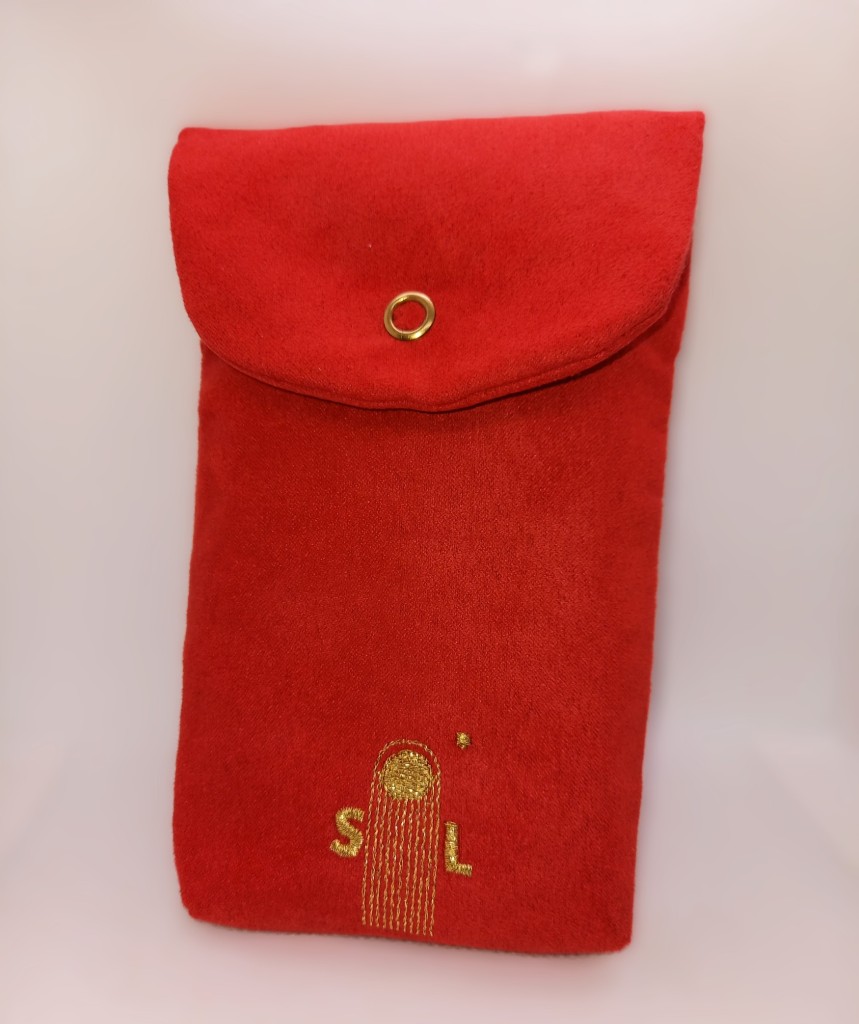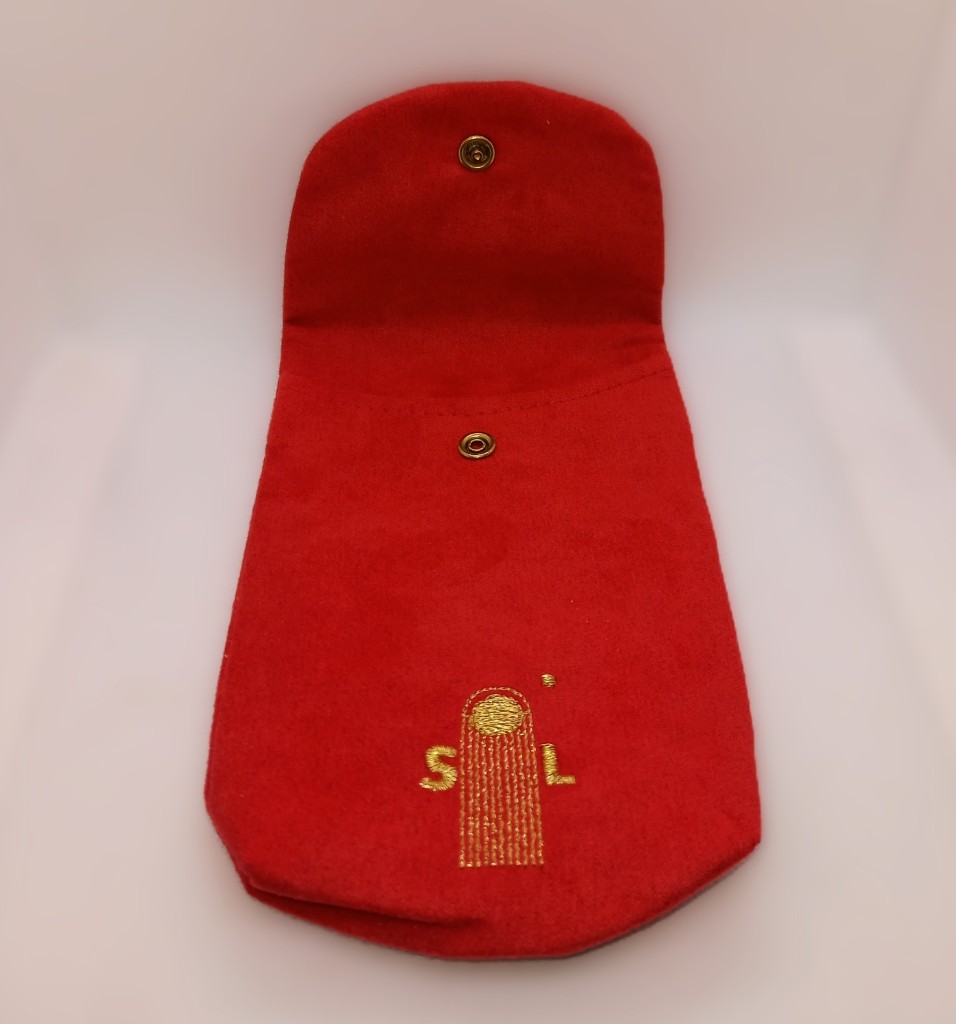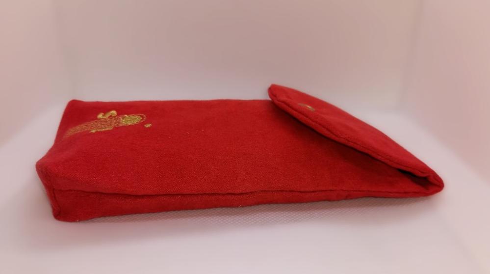 Sammetspåse med tryckknapp och gyllene brodyr.