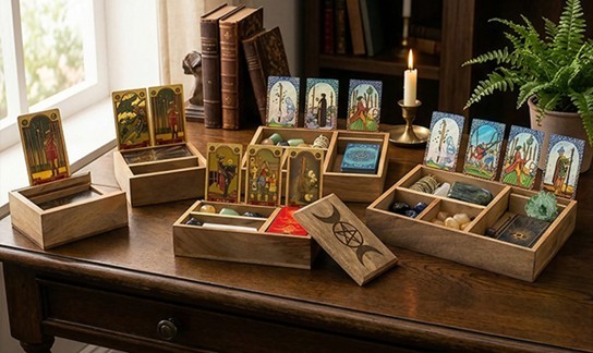 Ge dina tarotkort ett hem som både är praktiskt och magiskt. En liten men kraftfull förvaringslåda, handgjord i massivt mangoträ i Indien. Den är utformad för att skydda, organisera och lyfta fram dina kort i både vardagsanvändning och mer ritualistiska sammanhang.